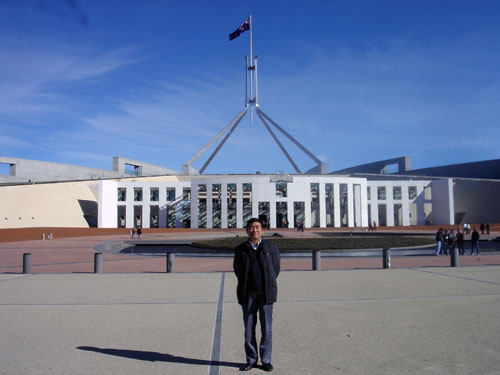 7月28日下午14:45分考察團拜會了堪培拉工商業(yè)機構,雙方就企業(yè)投資、綠色產(chǎn)業(yè)等共同感興趣的話題進行了洽談?芭嗬前拇罄麃喌氖锥,東北距悉尼240公里,西南距墨爾本500公里,城市位于澳大利亞山脈區(qū)的開闊谷地上,現(xiàn)為國家政治中心。堪培拉的城市設計十分新穎,環(huán)形及放射狀道路將行政、商業(yè)、住宅區(qū)有機地分開。為紀念庫克船長上岸200周年而建的“庫克船長紀念噴泉”水柱高達140 米,極為壯觀?芭嗬鳛檎v地及國會大廈和許多外交官邸的所在地,是個時髦的現(xiàn)代化城市?芭嗬牡貥税拇罄麃唶鴷–anberra Parliament House),建筑以及周邊建設總耗資11億澳元,是澳大利亞歷史上建造費最昂貴的建筑物。